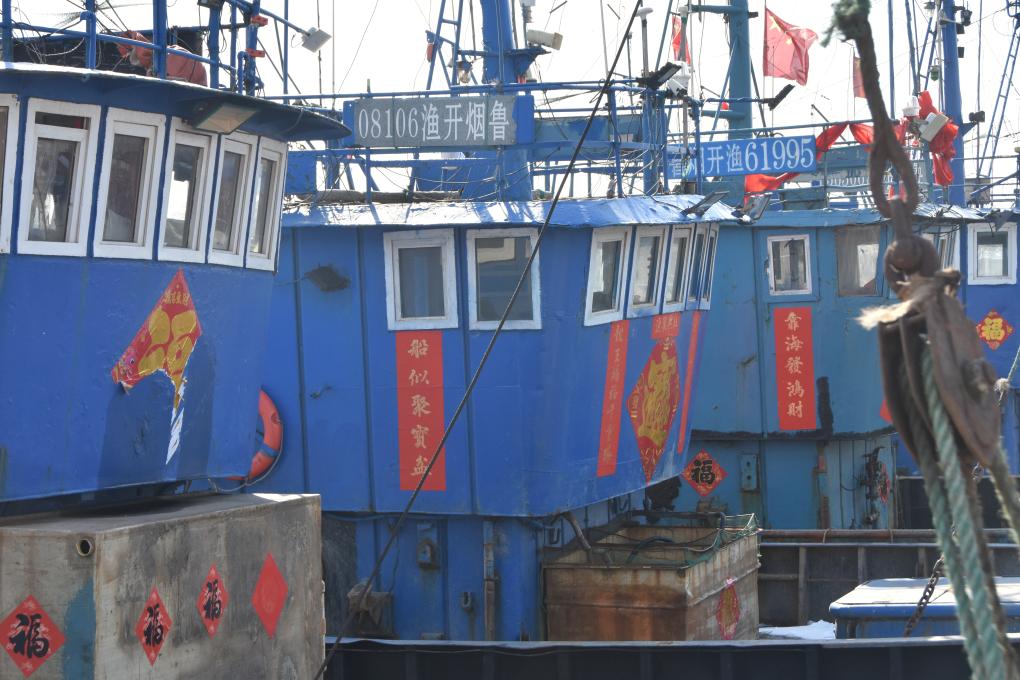 大季家街道山后初家村渔民刘明兴今年还要继续出海,他在自家的两条渔船贴上了吉祥的对联。“渔船大桅贴‘大将军八面威风’,二桅贴‘二将军开路先锋’,船头和船尾要贴专属对联,横批分别是‘海不扬波’和‘顺风相送’。”刘明兴说。