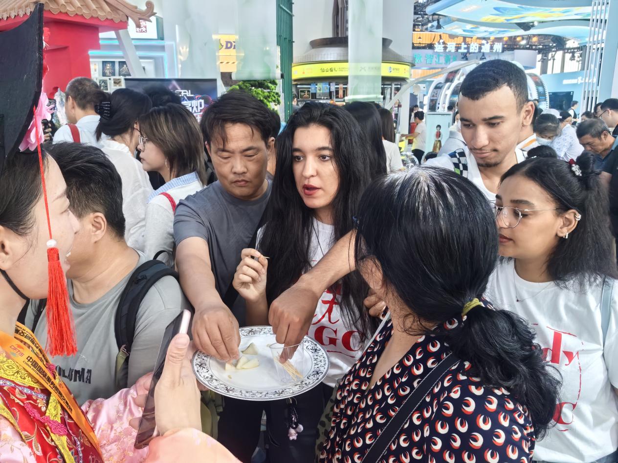 工作人员身着满族传统服饰,热情地向观众介绍产品。哪怕额头上沁出汗水,他们的笑容依然感染着每一位参观者。