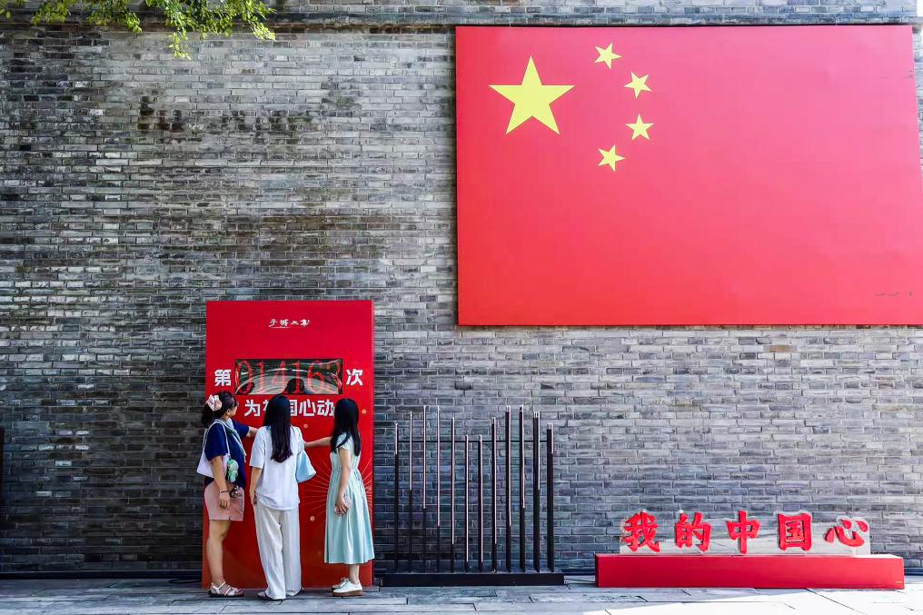 10月1日,在浙江嘉兴市南湖区建设街道子城城墙边,市民参加我为祖国心动打卡活动。