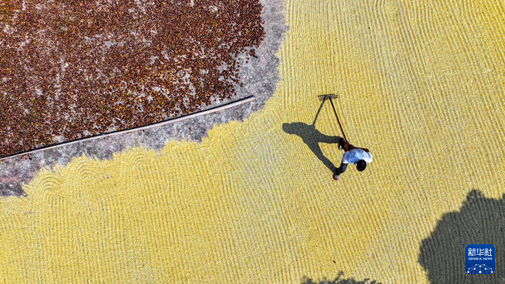 10月11日,湖南省常宁市兰江乡农民在晾晒稻谷(无人机照片)。