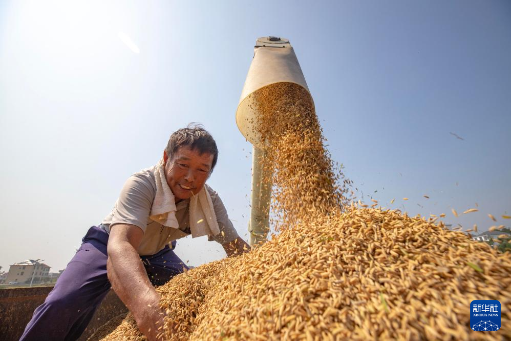 10月11日,在江西省庐山市星子镇翻身村,种粮大户将收获的水稻装车。