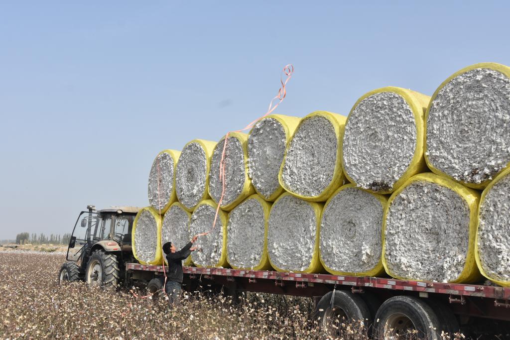 10月21日,采棉机在新疆阿克苏地区沙雅县的棉田中工作,旁边是刚采收打包好的棉花。新华社记者贾钊 摄